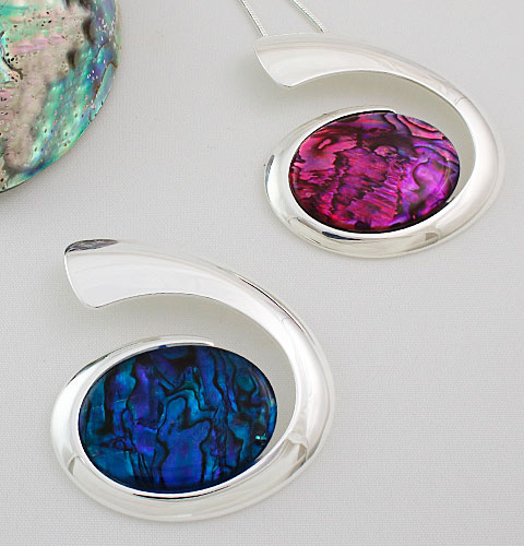 Abalone shells are found in many parts of the world. In New Zealand, they are known as Paua Shell. Ormer, Perlemoen, Venus-ears and Muttonfish, are other common names. The meat is a seafood delicacy and is environmentally farmed. The shells used for jewellery are a by-product of this industry. When carefully cut and polished the beautiful colours and patterns in the shells come into their own. The shells are often dyed in vibrant shades of blue, pink, purple, and green, in addition to their natural blue and green colours.