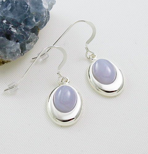 The Blue Lace Agate Offset Oval Earrings have Sterling Silver ear hooks and a silver plated drop of 20 mm.