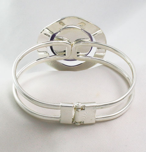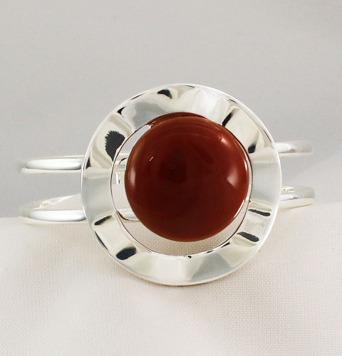 The Carnelian Rosette Bangle is crafted in quality Silver Plate. The bangle is set with a 25 mm Carnelian cabochon and has a circumference of 19 cm. It has a spring hinge which opens the bangle underneath the stone.