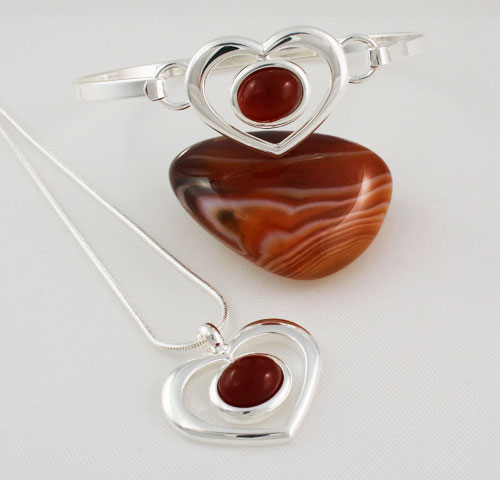 The Carnelian Small Heart Collection consists of a pendant and bangle both crafted in quality Silver-Plate.  The pendant drop is 25 mm and both are set with a 10×8 mm Carnelian cabochon with the bangle having a circumference of 18 cm.
