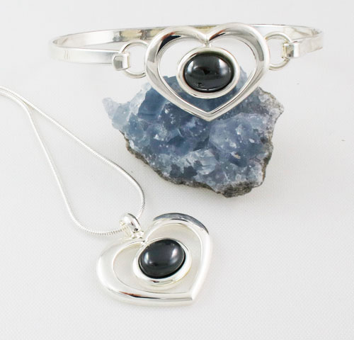 The Hematine Small Heart Collection.  A pendant and a bangle in silver plate set with 10×8 mm Hematine cabochons.  The pendant drop is 25 mm and the bangle circumference is 18 cm.