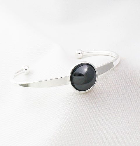 The Hematine Torque Bangle is crafted in Silver Plate and set with a 15 mm Hematine cabochon.