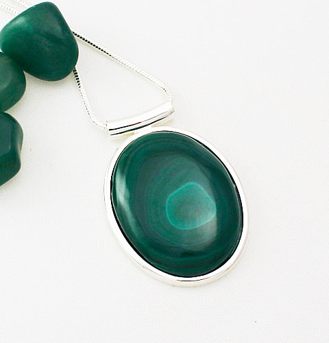 Malachite Oval Drop Pendant in quality Silver Plate is set with a 40×30 mm Malachite cabochon. The overall pendant drop is 48 mm.