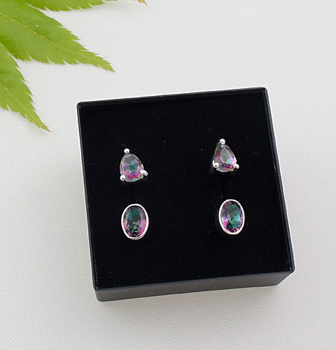 The Mystic Topaz Stud Earrings are crafted in Sterling Silver and available in an Oval mount or a Claw-Set Teardrop. The oval mount is set with an 8×6 mm Mystic Topaz gemstone and the teardrop measures 7×5 mm