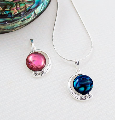 The Abalone Crescent Moon Pendant in silver plate, is available in two colours – pink or blue. The pendant drop is 2.5 cm.  You can order a fine-weight chain of your required length to complement the pendant by clicking on this link.