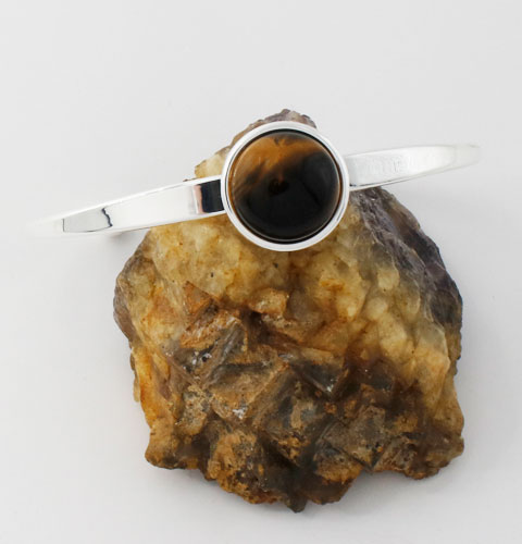 The Tiger’s Eye Torque Bangle in Silver Plate is set with a 15mm Tiger’s Eye cabochon.